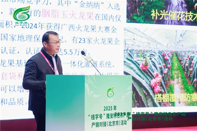 在品牌推介环节,隆安县农业农村局副局长黄方海从种植环境、品质标准、营养价值、产业规模等方面,全面展示了南宁火龙果等特色农产品的核心优势。他指出,南宁火龙果已实现“地理标志、绿色食品、达标合格证”三证齐全,品质可靠、风味独特。