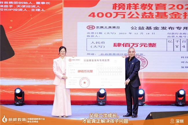 值得一提的是,榜样公益事业取得重大突破。晏少银先生分享2026年公益事业的布局,在随后的公益慈善资金授权仪式上正式交付于榜样教育蔡卓老师400万慈善基金,充分彰显榜样教育积极履行社会责任的大爱、使命与温度。